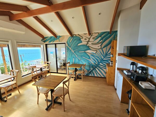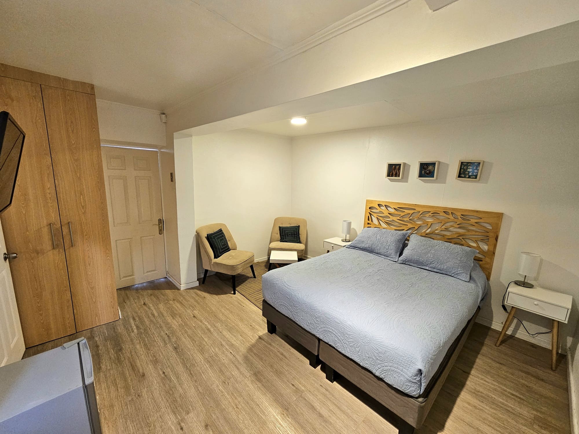 Ubicada en el segundo piso, es una habitación doble con baño privado, cama matrimonial y hermosa vista al mar.